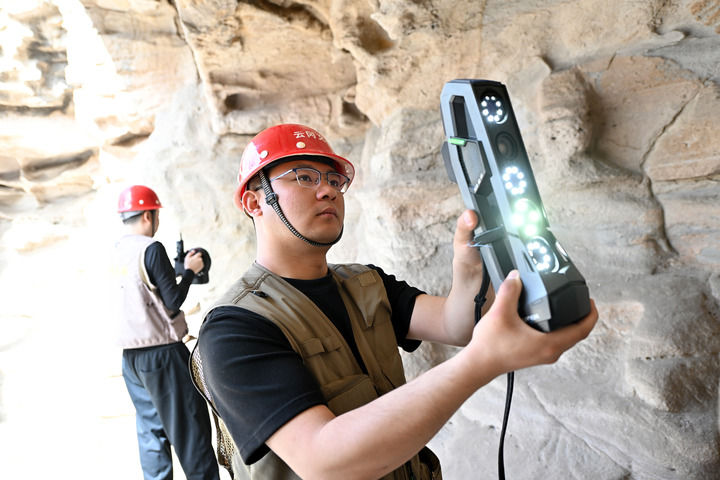 在山西大同云冈石窟,云冈研究院数字化保护中心工作人员在进行数字化信息采集(2025年4月16日摄)。新华社记者 詹彦 摄