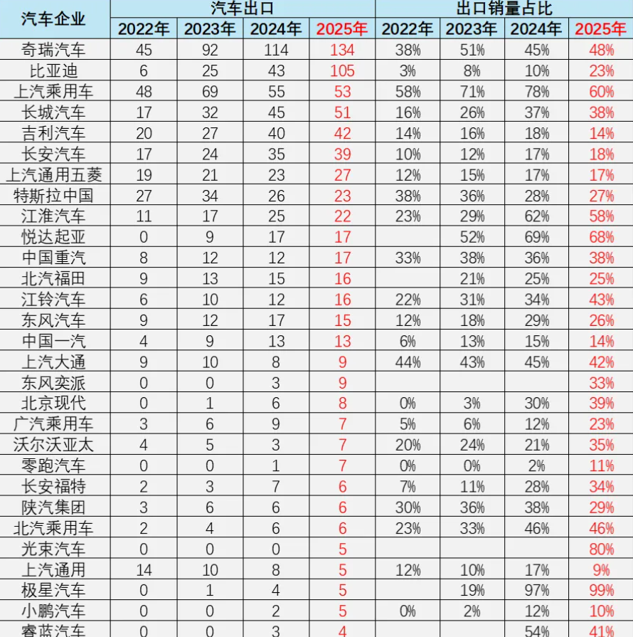 从具体企业表现来看,奇瑞汽车以134万辆的出口量位居首位,同比增幅达20%,占其总销量比重达到48%,创下历史新高。比亚迪紧随其后,全年出口105万辆,出口占比升至23%,较2024年大幅提升,反映出其全球化战略加速落地。上汽乘用车出口53万辆,占比达60%,为行业最高,显示出其在海外市场的深度布局能力。长城汽车出口51万辆,占比38%,稳居前列。