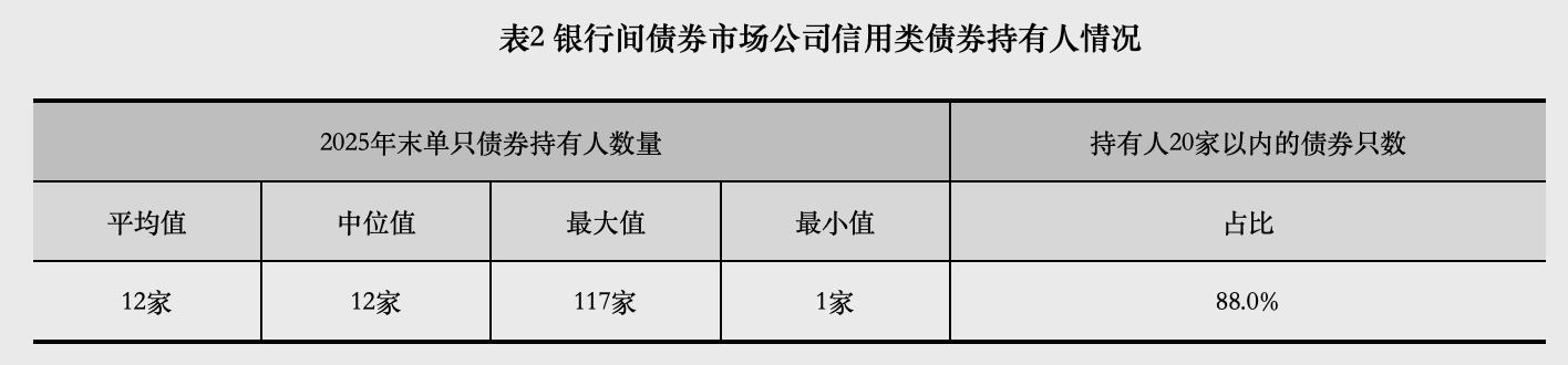 截至2025年末,银行间债券市场的法人机构成员共3923家,全部为金融机构。从持债规模看,公司信用类债券前50名投资者2持债占比53.4%,主要集中在国有大型商业银行(自营)、公募基金(资管)、保险类金融机构(资管)等;前200名投资者持债占比84.5%。