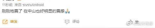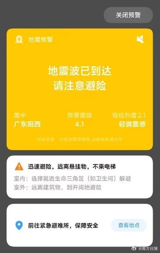 多地网友表示有震感,“我在深圳家里,感觉沙发晃了一下”“在中山有明显的震感”“吓得午睡的我跳出来,我妈衣服都没穿,电视机发警报,我爸吓得大喊我们跑下了楼”“广州等地提前51秒收到预警”。还有网友晒出手机弹出预警提醒。