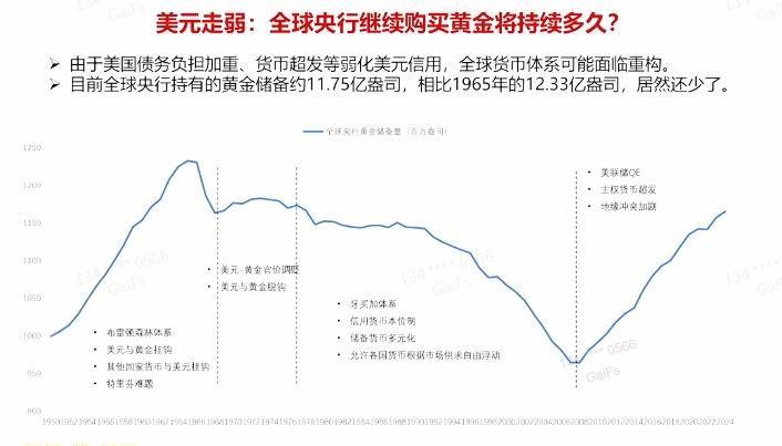 我们现在全球央行,所持有的黄金规模比60年前还要少,而60年以来,全球的黄金存量增加了⅔。黄金规模在不断增加,但是各国央行持有黄金的规模,反而比60年前还少,这显然是不符合逻辑的,所以我觉得黄金还是会被增持。但是,增持黄金不等于黄金会无限制地上涨,因为价格有价格的波动周期,央行有央行的行为,你不能把两者直接划等号。就像当年央行在不断减持黄金的时候,黄金阶段性同样也能涨,这个逻辑是一样的。