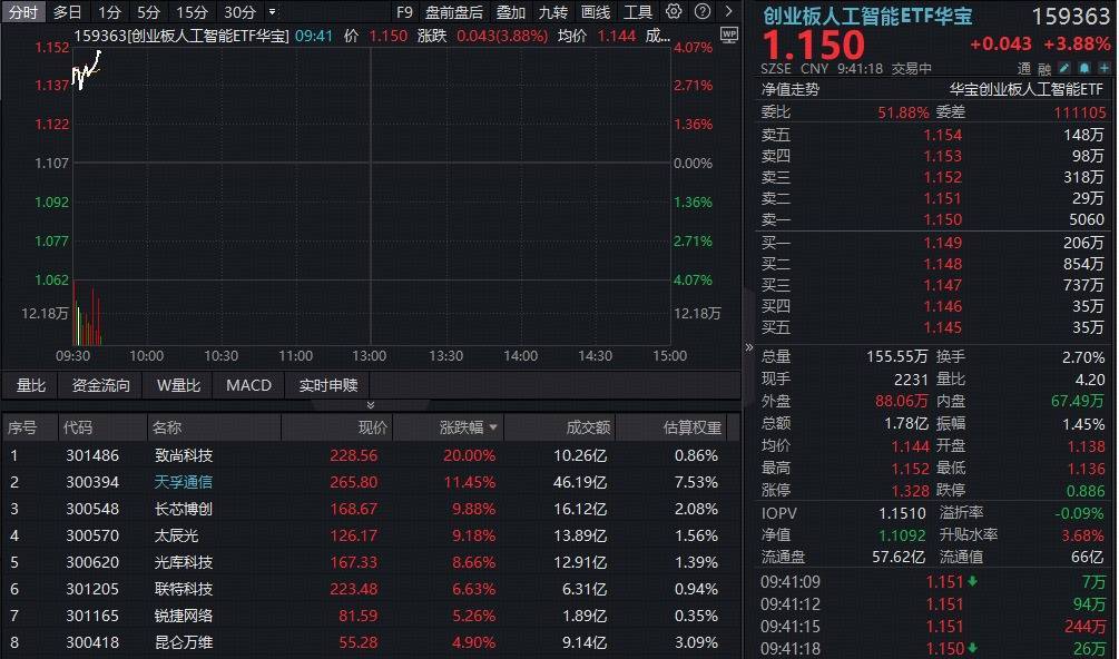2月3日早盘,CPO光模块大反攻,致尚科技20CM涨停,天孚通信猛涨超11%再创历史新高,长芯博创、光库科技、太辰光等多股涨超8%,中际旭创、新易盛涨超3%。创业板人工智能ETF(159363)场内反包大涨4%线上配资知识网,成交额环比放量明显,近两日吸金1.5亿元!