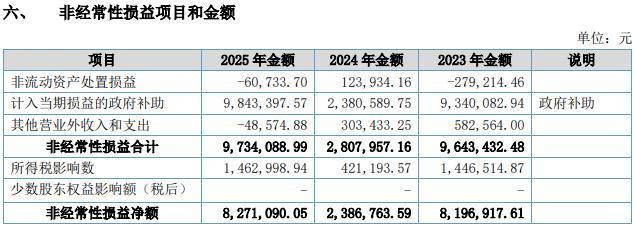进一步分析来看,净利润的增长主要得益于非经常性损益大幅增加246.54%,其中政府补助高达984.34万元,同比增长313.48%。若剔除政府补助,难以实现利润增长。2025年,苏轴股份实现毛利润2.63亿元,低于2024年水平。